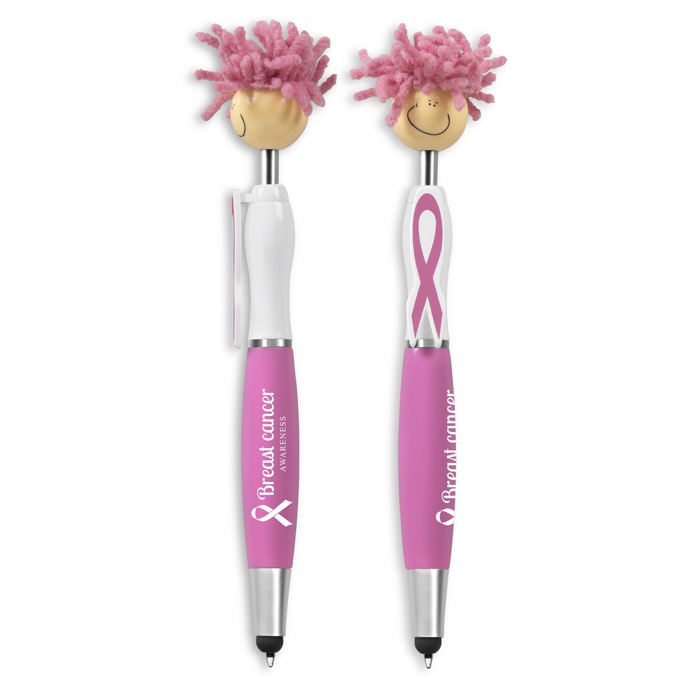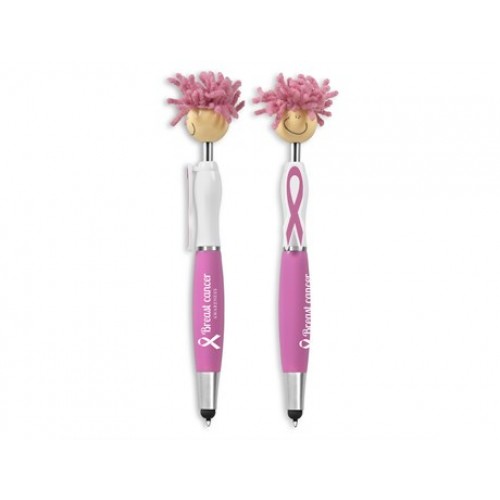 Show your support by promoting Breast Cancer Awareness while ensuring you stand out with this creative and unique promotional mop topper stylus pen. Add a personal touch by branding your company logo or message. Features include a pink plastic pen barrel, soft silicone stylus tip, smiley face, pink microfibre hair that functions as a screen cleaner, clip with pink Breast Cancer Awareness ribbons.